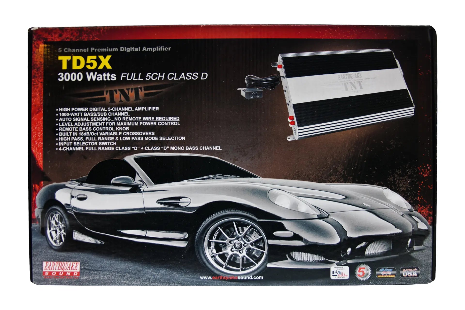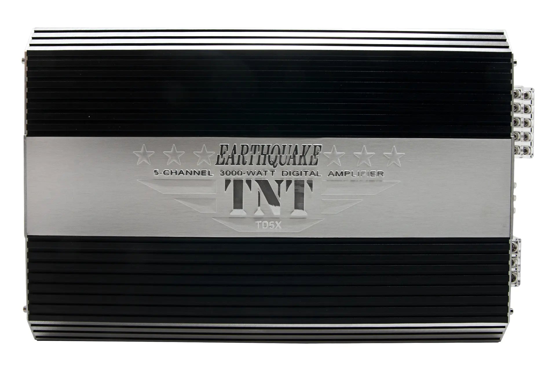 One Install Does It All: For the past year and half Earthquake engineers have been working on providing consumers with the best 5 channel amplifier; finally, the TD5X was conceived. TD5X’s 3000 watts of max power is more than anyone will ever need in such an install. TD5X has 4 channels for your front and rear sound quality imaging and with over 100 WRMS per channel, it is more than enough for any coaxial, 6x9 or components speakers. On top of that, channel 5, the subwoofer channel, outputs over 400 WRMS thus driving your subs to deliver the best bass you can dream of.